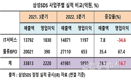 사업부별 매출 증가율, ‘물류 35.4%, IT 7.8%’...영업익은 ‘67.4% vs –34.6%’ ...IT부진에 발목