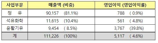 이번 3분기에는 윤활 부문이 큰 역할을 했다. 매출은 전체에서 8.5%를 차지했지만 영업이익은 74%를 차지하며 효자역할을 톡톡히 했다.