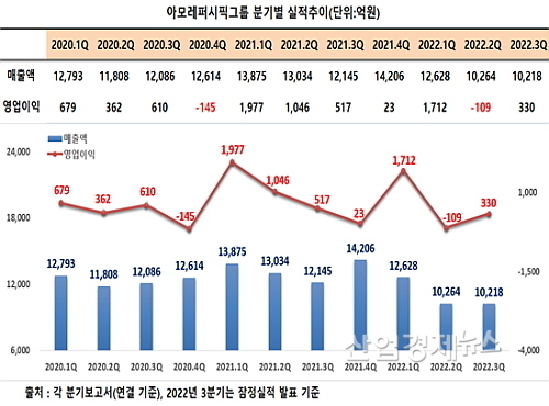 [엔트로피타임즈 민경종 기자] 아모레퍼시픽그룹(아모레G)의 3분기 영업실적이 중국 주요도시 봉쇄 지속에 따른 현지매출 급감과 면세채널 부진이라는 직격탄에 휘청, 외형과 손익이 동반 감소한 것으로 밝혀졌다.