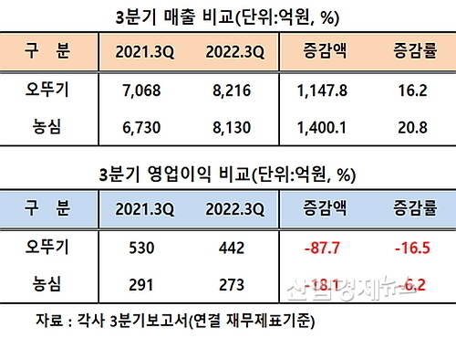 매출증가율, 농심이 오뚜기에 4.6%P 앞서..지난 2분기 1.3%P차 패배 설욕