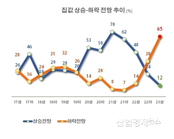 부동산R114는 전국 1738명을 대상으로 '내년 상반기 주택시장 전망'에 대해 설문조사를 실시했는데 조사결과, 내년 상반기 주택 매매가격이 하락할 것이라는 전망이 65%로, 상승할 것이라는 전망 12%보다 압도적으로 많았다.