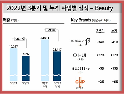 더욱이 동 기간 중 LG생활건강 뷰티사업부 매출이 2조3417억 원으로 지난해 3분기(누적기준) 3조3011억 원 대비 29.1% 급감하는 와중에도 홀로 22% 성장하는 저력을 보여 업계의 주목을 받고 있다.