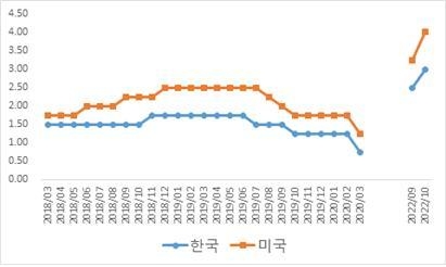 ■ 명목 기준금리 美 4.0% > 韓 3.25%...실질 기준금리 美 -3.75% < 韓 -2.70%