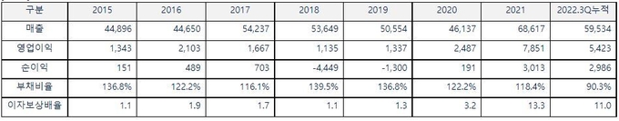 사업구조재편은 경영 성과와 재무 구조 개선으로 이어졌다. 별도 기준 2022년 3분기 말 동국제강 부채비율은 90.3%로 두자릿수대에 진입했다. 이는 2015년 136.7%에서 46.4%p 개선된 수치다. 이자보상배율(영업이익/금융비용)은 2015년 1.1배 수준에서 2022년 3분기말 현재 11.0배로 우량 회사로 탈바꿈했다.