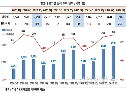 빙그레가 최근 공시한 3분기보고서에 따르면 먼저 연결재무제표기준 3분기 매출은 약 3906억 원을 시현, 전년 동기 3545억 대비 약 361억이 늘어 10.2% 가량 증가했다.