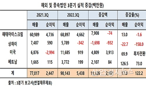 3Q 매출 전년대비 10.2%↑..해태아이스크림과 미국·베트남 법인 성장 가세