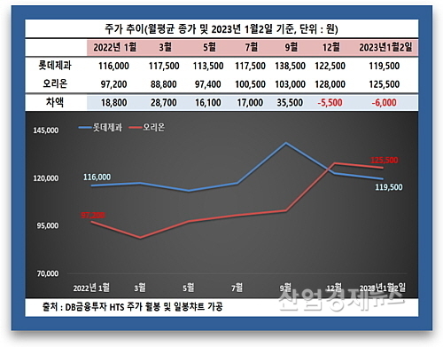 DB금융투자 HTS에 의거해 양사의 주가흐름을 살펴보면 먼저 지난 2일 주식가격(종가)은 오리온이 125,500원과 롯데제과 119,500원을 기록, 지난해 12월(월평균가격)에 이어 국내 증시상장 제과업종 중 가장 높은 가격을 유지하며 당당히 ‘대장주(株)’ 자리에 올라섰다.