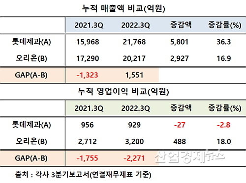 3분기 누적 영업익 증가율, 오리온 18.0% vs 롯데제과 –2.8%...압도적 우위
