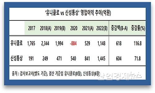 영업익 증가율, ‘유니클로 116.8% vs 신성통상 71.8%’..유니클로가 45%p↑