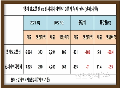 양사의 지난해 3분기 보고서에 따르면 연결재무제표기준 3분기까지 누적 매출은 롯데정보통신이 약 7294억 원을 시현, 전년 동기 6894억 대비 약 401억이 증가해 5.8% 성장한 반면에,