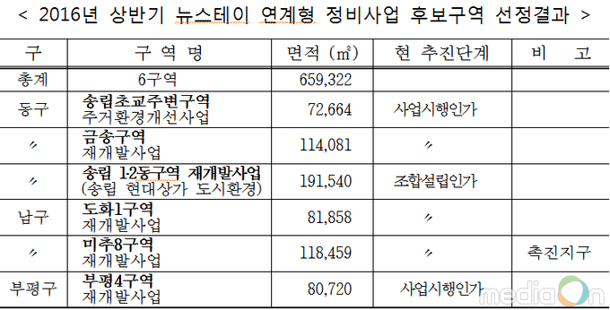 (미디어온) 인천광역시는 국토교통부의 2016년 상반기 뉴스테이 연계형 정비사업 공모결과 인천지역 6개 정비구역이 뉴스테이 정비사업 후보구역으로 선정됐다고 밝혔다.