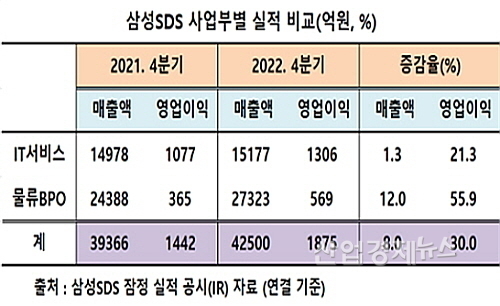 또 삼성증권 오동환 연구원은 “4분기 IT서비스 매출은 경기 위축으로 고객사가 IT 투자를 연기함에 따라 성장률이 1.3%로 둔화했고, 물류 매출은 항공·해상 운임 하락으로 감소를 예상했으나 물동량 증가와 내륙 운송과 창고 매출 증가로 전분기 수준을 유지했다"고 평가했다.