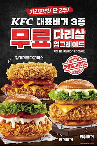 이 행사는 고객에게 한층 더 육즙 가득한 다리살의 맛을 즐길 수 있도록 마련한 것으로, KFC에서 가장 인기 있는 징거버거, 타워버거, 징거더블다운맥스를 기존 통가슴살 필렛에서 닭다리살 필렛으로 무료 업그레이드해 주는 내용이다.