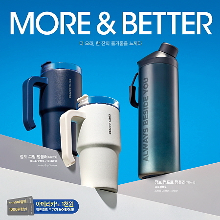 이어 31일에는 대용량 사이즈에 편의성까지 보강한 점보 텀블러 3종도 선보였다. ▲그립 텀블러 2종 ▲컴포트 텀블러 1종으로 구성해 출시했는데, 그립 텀블러는 22oz의 대용량 사이즈의 손잡이형 스텐 텀블러로 ▲미드나잇블루 ▲쿨그레이 색상으로 만나볼 수 있으며, 음용구 커버를 통해 먼지 유입 방지 및 보온 보냉 유지 기능을 높였다.
