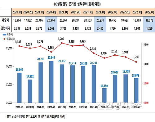 LG생활건강이 최근 공시한 4분기 잠정영업실적(IR자료)에 따르면 연결재무제표기준 매출은 1조8078억 원으로 2021년 4분기 2조231억 원 대비 2153억이 줄어 약 10.6% 감소했고,