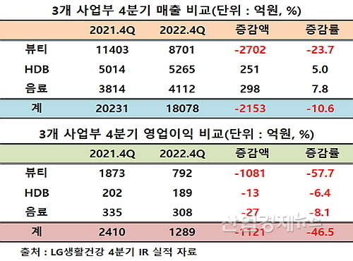 사업부별 4Q 손익, 화장품에 생활용품, 음료까지 전 사업부 모두 뒷걸음..어닝쇼크 합작