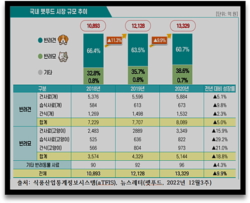 농수산식품유통공사(aT)의 식품산업통계정보시스템(aTFIS 펫푸드, 2022년 12월3주)에 따르면 2020년 기준 국내 펫푸드 시장규모는 약 1조3329억 원으로 전년도 1조2128억 대비 약 1201억 원이 늘어 9.9% 가량 성장했다.