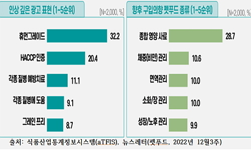 aT에 따르면 먼저 인상 깊었던 광고 표현은 ‘휴먼그레이드’ 32.2%, HACCP 인증 20.4%, 각종 질병 예방치료 11.1% 순으로, 또 향후 구입하고 싶은 팻푸드로는 종합영양사료 28.7%로 압도적 1위를 차지했고 이어 체중(비만)관리 10.8%, 면역관리 10.0%의 순으로 나타났다.