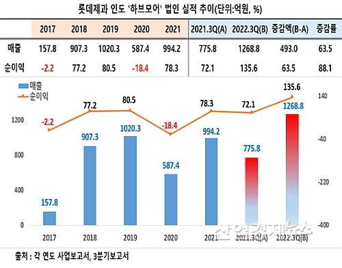 롯데제과 사업 및 3분기보고서에 따르면 롯데제과가 인수한 지난 2017년 기준 매출 157.8억 원과 2.2억 원의 영업 손실을 기록한 하브모어사는 지난해 9월말 기준으로 1268.8억 원의 매출과 135.6억 원의 영업이익을 시현, 양호한 성적을 기록했다.