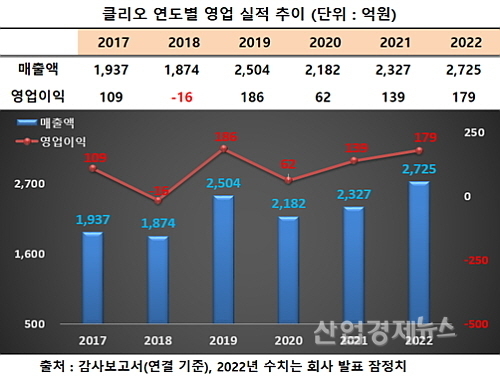 클리오가 최근 공시한 연결재무제표 기준 잠정영업실적에 따르면 지난해 매출은 약 2724.5억 원으로 전년도 2327.4억 대비 약 397.1억 원이 늘어 17.1% 성장했고, 영업이익도 179억 원을 시현 전년도 139억 대비 무려 28.6% 증가한 양호한 성적표를 시장에 내밀었다.