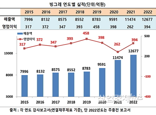 지난 7일 빙그레가 공시한 감사보고서(주총승인 전 보고서)에 따르면 연결재무제표기준 지난해 매출은 1조2677억 원으로 전년도 1조1474억 대비 10.7% 증가해, 지난 2021년 기록한 연매출 ‘1조 클럽’에 안착하는 모양새를 연출했고,