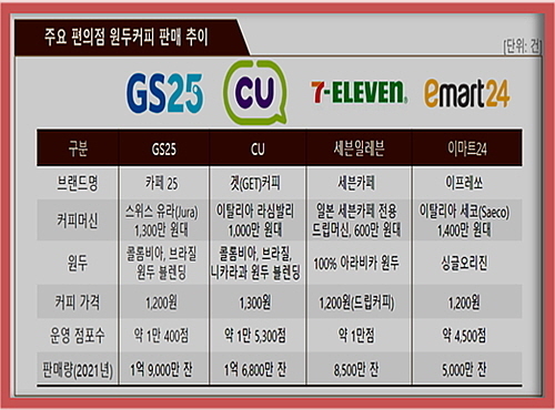 편의점 4사별 사용 중인 커피머신 및 원두, 가격, 운영점포수 등 비교