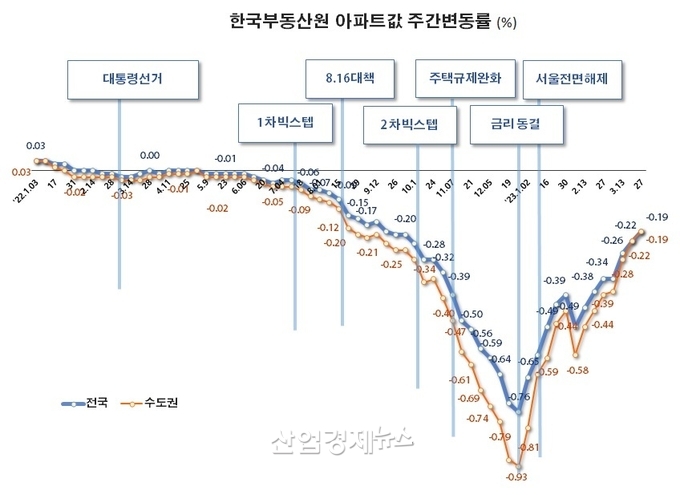 [엔트로피타임즈 문성희 기자] 지난해 7월과 10월, 한국은행이 빅스텝을 두 차례나 단행하면서 주택가격은 예전에 없던 급한 속도로 하락했고, 올해 2월, 3월에 금리인상이 없자 하락속도는 또 빠르게 둔화되고 있다.
