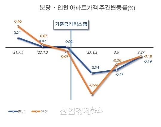 이러한 움직임은 서울뿐만이 아니라 수도권에서도 비슷한 흐름을 보였다. 수도권에서 가격이 비교적 높은 분당의 아파트가격과 인천의 아파트가격을 비교해 보면, 상승기에는 인천이 0.46%로 폭등세를 보였다. 분당도 0.21%를 보이며 서울보다 높은 상승률을 기록했다.