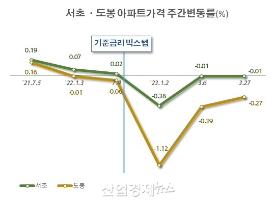 서울의 경우, 서초 아파트와 도봉 아파트의 가격변화 추이를 비교해 보면, 가격 상승기인 2021년 7월에는 서초가 0.19%, 도봉이 0.16%로 비슷한 변동률을 보였다. 하지만 지난해 7월 이후 가격 하락기에는 서초가 -0.38%를 기록한 반면, 도봉은 -1.12%로 가격이 폭락하는 모습을 보였다.