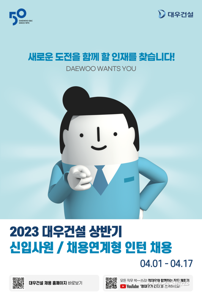 대우건설은 최근 5년간 연평균 100명 이상의 신입사원을 선발하며 건설업계에서 가장 활발하게 신입사원 채용을 진행중이다. 이번 상반기 채용에서는 4학년 1학기생들이 지원가능한 채용 연계형 인턴을 도입했는데, 회사의 미래자원이 될 우수한 인재를 조기 선발해 ‘건설 인재사관학교’의 명성을 이어가겠다는 계획이다.