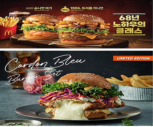 먼저 맥도날드는 지난달 30일 양파 풍미 담은 ‘1955 트리플 어니언’ 버거를 출시하자 이에 질세라 KFC와 슈퍼두퍼는 지난 4일 징거버거 출시 27주년의 대미를 장식할 메뉴로 ‘블랙라벨치즈징거버거’와 시즌 한정 메뉴로 ‘꼬르동 블루 버거 콤보’를 제각각 선보이며 맞불을 논 것.