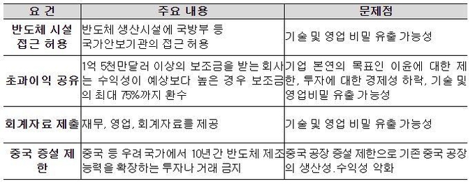 상세한 회계자료 제출 요건은 재무자료뿐만 아니라 주요 생산 제품, 생산량, 상위 10대 고객, 생산 장비, 원료 등의 자료까지 제출을 요구하고 있다. 한경연은 반도체 보조금 혜택을 위해 반도체 생산 관련 자료, 원료명, 고객정보 등의 영업 비밀까지 공개할 수는 없다고 말했다.