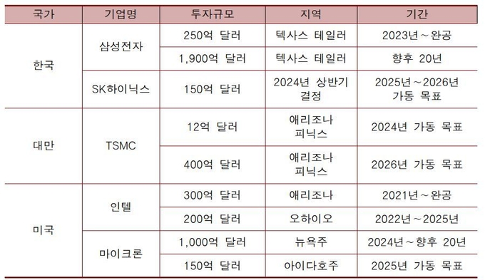 미국반도체산업협회에 따르면 2020년 이후 글로벌 반도체 기업들이 발표한 미국 내 투자계획은 40여 건, 총 투자규모는 2천억 달러(약 247조 3,600억원)에 달한다.