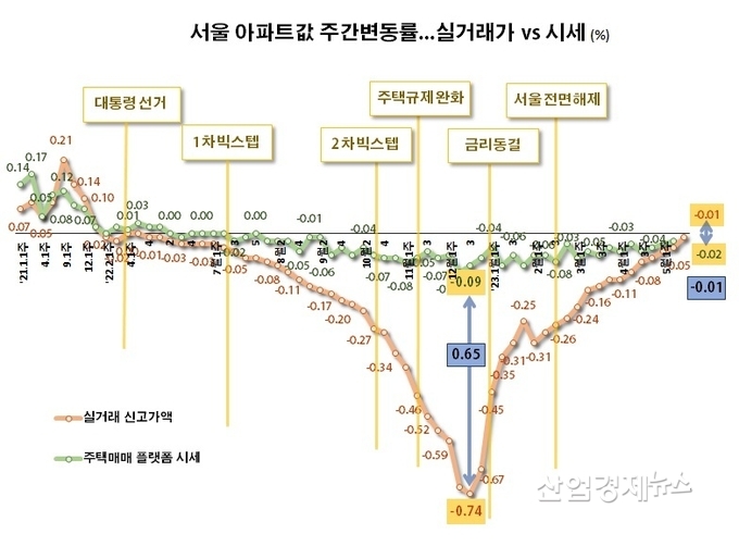 국세청에 신고된 실거래가격을 중심으로 통계를 작성하고 있는 한국부동산원이 조사한 지난주 서울 아파트값의 주간변동률은 -0.01%로 조사됐다. 반면, 주택매매플렛품에 올라온 매도호가를 중심으로 주택가격을 조사하는 부동산R114의 서울 아파트값 주간변동률은 -0.02%로 조사됐다.