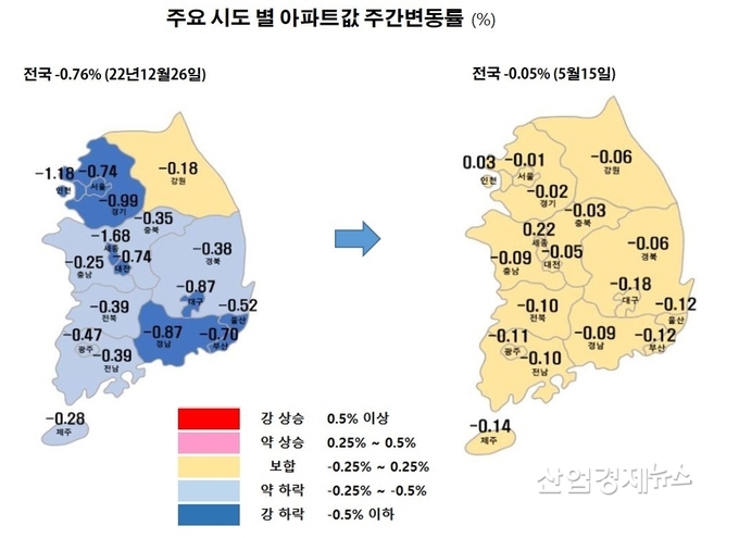 한국부동산원이 작성하는 '전국 아파트값 주간변동률 지도'를 보면 지난해 말에는 강원을 제외한 전국 모든 지역이 하락세를 나타내는 푸른색으로 그려졌고, 서울, 수도권과 세종, 대전, 대구, 부산 등 대도시 지역은 급락세인 짙푸른색으로 표시됐다.