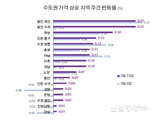 지난주 가격이 상승한 지역은 이 외에도 강동, 동작, 성남수정, 성남중원, 광명, 오산, 평택, 인천계양, 인천연수 등 수도권 총 72개 지역 중 27개 지역이다. 상승 지역 비중이 38%로 세 곳 중 한 곳 이상이 그동안의 하락세를 벗어나 상승세로 전환된 것으로 나타났다.