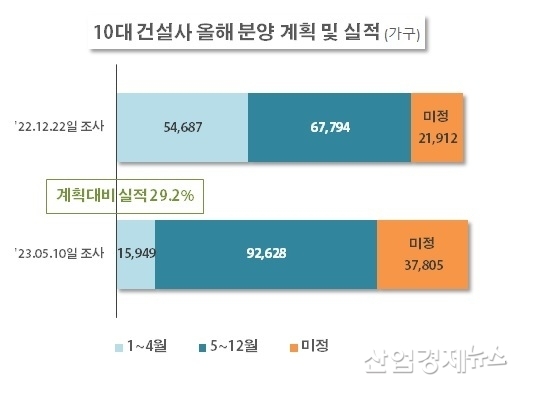 부동산R114에 따르면, 10대 건설사를 상대로 지난해 말에 조사한 올해 분양계획은 14만 가구였고, 그 가운데 1~4월 계획물량은 5만 4,687가구였다. 하지만 지난 5월 10일 조사에 따르면 10대 건설사가 실제로 1~4월에 분양한 물량은 1만 5,949가구에 그쳤다. 계획물량의 29.2%로 3분의 1에도 못미쳤다.