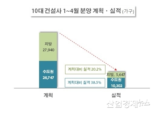 특히 10대 건설사는 지방 계획 물량을 많이 미룬 것으로 나타났다. 10대 건설사의 올해 1~4월 계획물량은 수도권이 2만 6,747가구, 지방이 2만 7,940가구로 비슷했다.