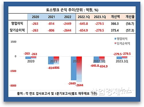 [엔트로피타임즈 민경종 기자] 지난 2021년 6월 은행업 본인가를 받고 영업을 개시한 인터넷전문은행 토스뱅크에 최근 낭보가 잇따르고 있어, 이 같은 호재가 매해 영업적자 행진을 마감시키고 창사 첫 흑자로 이끌 마중물이 될지 은행가의 관심이 쏠리고 있다.