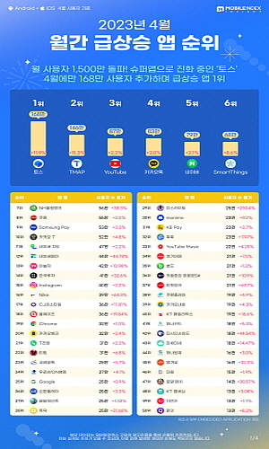 조사 결과, 토스앱 사용자 수 증가율은 11.9%에 월 사용자 수도 1500만을 돌파한 것으로 확인됐으며, 2위는 146만 명가량 증가한 ‘TMAP’, 3위는 약 87만 명이 증가한 ‘YouTube’가 차지했다는 것.