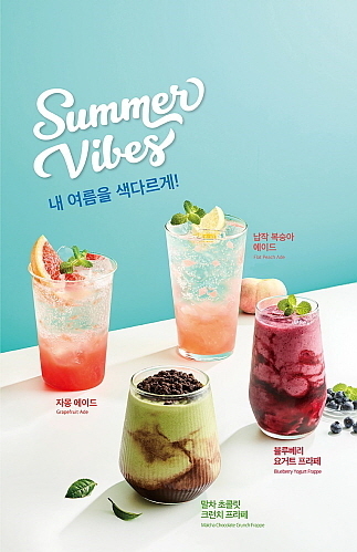이번 신메뉴는 자몽, 납작 복숭아 등 과일을 활용한 에이드 2종과 블루베리와 요거트, 말차와 초콜릿의 조합으로 출시된 프라페 2종이다.
