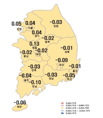 하지만 지방의 경우, 지난주까지 보합세를 보였던 충북, 충남 등 중부권도 다시 -0.02%로 하락 전환했고, 대구 -0.09%, 부산 -0.05%, 광주 -0.04% 등 지방 대도시들은 여전히 하락세에 머물러 있는 것으로 조사됐다.