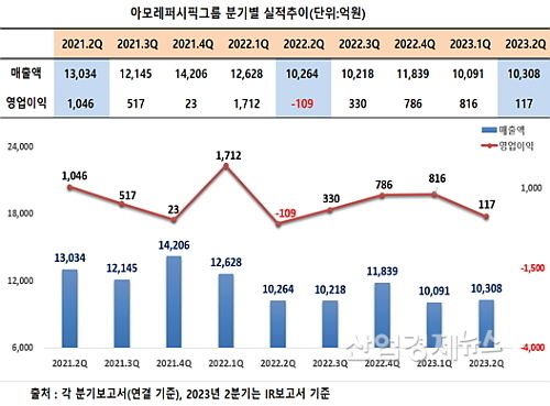 메리츠증권 하누리 연구원은 “'아모레G는 2023년 2분기 매출액 1조308억원(이하 YoY), 영업이익 117억원 (흑전)으로, 기대치를 하회(컨센서스 대비 영업이익 -79.7%) 했다"며 "주력 자회사 아모레퍼시픽 약세에다 핵심 브랜드 이니스프리 적자가 더해진 때문"이라고 설명했다.