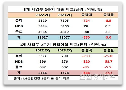LG생활건강의 2분기 잠정영업실적(IR자료)에 따르면 연결기준 매출액은 1조8077억 원으로 2022년 2분기 1조8627억 대비 550억 가량이 줄어 약 3.0% 감소한 반면, 영업이익은 1578억 원 시현에 그쳐 전년 동기 2166억 대비 27.1%나 감소하는 부진한 성적표를 내밀었다.