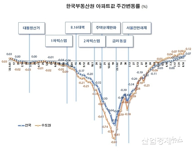 한국부동산원에 따르면 8월 21일 기준 전국 주택가격 주간변동률은 0.07%를 기록했다. 지난해 12월 -0.76%를 기록하며 '폭락'이라고까지 불렸지만 올해 들어와 하락폭을 빠른 속도로 줄이고, 7월에 들어서면서 보합세로 올라서더니 8월에 들어서자 상승세를 보이기 시작했다.