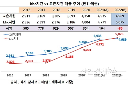 2022년 5075억 매출로 교촌의 4989억을 86억 가량 앞서며 1위 등극