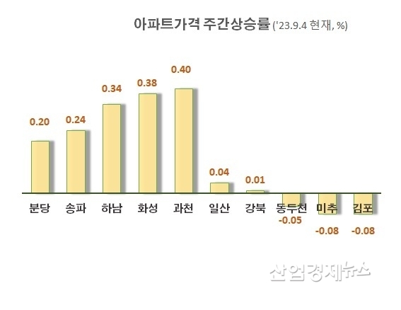 지난 주 수도권의 지역별 상승률을 보면, 평균 20억을 넘게 호가하는 서초·강남·송파 등 강남 3구는 지난 3월부터 지난주까지 여전히 높은 상승률을 유지하고 있다. 그리고 최근에는 강남 연계지역인 과천, 하남, 분당이 높은 상승세를 타고 있다. 과천은 0.40%, 하남은 0.34%, 분당은 0.20%로 전국에서 가장 높은 상승률을 기록하고 있다.