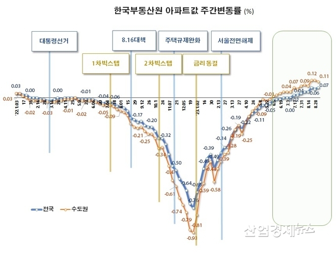 한국부동산원은 9월 4일 기준 전국 아파트값 주간변동률을 발표했다. 전국 평균 주간변동률은 0.07%로 한 주 전 0.06%보다 0.01%p 상승했다. 전국 변동률은 7월 초 하락세를 벗어난 후 7월 말부터 상승세로 전환됐고 매주 상승률을 높이고 있다.