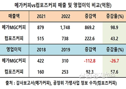 이는 가맹점에 커피 등의 원재료 공급과 가맹비, 로열티, 교육비 등을 수입원으로 하는 가맹본사(메가, 컴포즈커피)의 외형은 늘어날 수밖에 없는 구조라는 것이 업계 관계자의 설명이다.