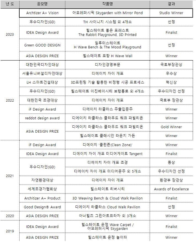 한편, 현대건설은 최근 3년간 세계 3대 디자인상인 ‘IDEA’, ‘iF’ 및 ‘reddot’ 디자인어워드를 5회 수상하는 그랜드슬램을 포함하여 국내 건설사 최초로 미국 굿디자인에 선정되는 등, 국내외 각종 디자인상을 휩쓸며 조경 분야의 디자인 경쟁력을 입증해왔다.